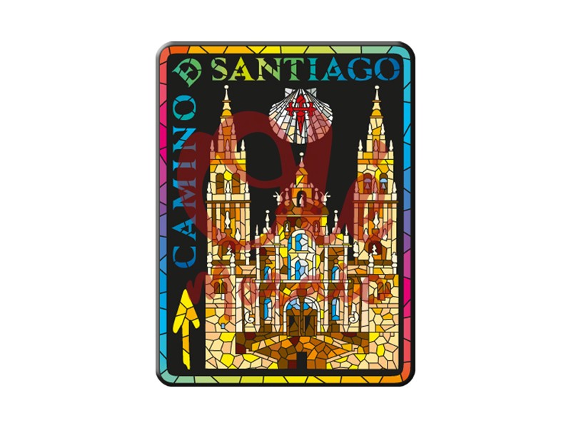 Imán metálico del Camino de Santiago, de 8 cm. Este atractivo imán muestra una representación colorida y estilizada de la famosa Catedral de Santiago, enmarcada en negro para resaltar sus detalles arquitectónicos en tonos amarillos, azules y terracota. Incluye el texto “CAMINO SANTIAGO” en la parte superior y una flecha que simboliza la ruta. Ideal para recordar este emblemático recorrido.