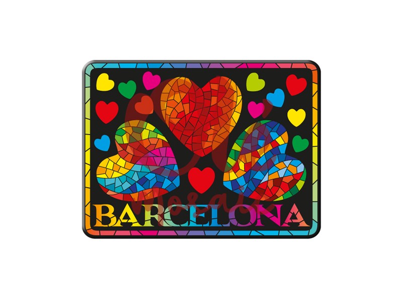 Imán metálico con forma de corazón, inspirado en los coloridos mosaicos de Barcelona. Con un tamaño de 8 cm, este atractivo diseño presenta corazones en vibrantes tonos rojos, azules, verdes y amarillos sobre un fondo negro. La palabra «Barcelona» destaca en letras amplias y coloridas, realzando la esencia creativa de la ciudad. Ideal para decorar tu nevera, este imán es un recuerdo único que celebra el amor y la vida en la capital catalana.