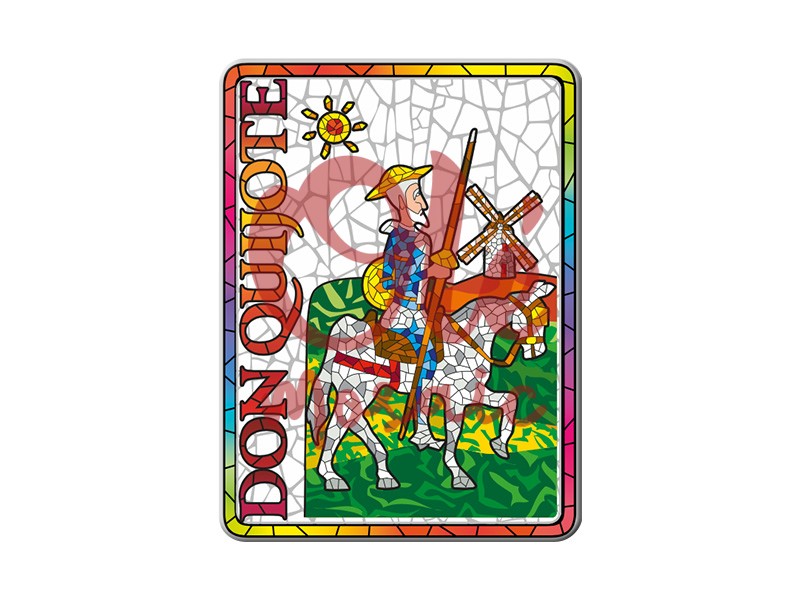 Imán metálico de 8 cm que representa a Don Quijote, una de las figuras más emblemáticas de la literatura española. Este colorido imán presenta un diseño inspirado en el arte del mosaico, con tonalidades vibrantes que resaltan al icónico caballero junto a su fiel corcel. El fondo verde y el sol radiante añaden un toque alegre, mientras que el texto «DON QUIJOTE» subraya su importancia cultural. Un recuerdo perfecto de la tradición literaria española.
