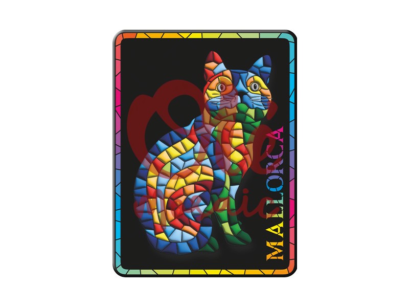 Imán decorativo de metal con la figura de un gato estilizado, inspirado en el arte colorido de Mallorca. Este imán de 8 cm combina una vibrante paleta de colores en un diseño de mosaico, destacando un gato de formas onduladas y ojos expresivos que capturan la esencia de la fauna local. El fondo negro resalta aún más los tonos brillantes, mientras que la palabra «MALLORCA» impresa en color añade un toque distintivo y artístico, convirtiéndolo en un recuerdo perfecto.