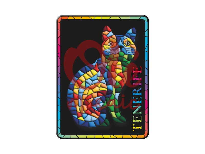 Imán metálico de 8 cm decorado con un vibrante diseño de un gato inspirado en la cultura tinerfeña. Este colorido imán presenta una representación en mosaico llena de tonalidades alegres como el azul, el verde, el rojo y el amarillo, sobre un fondo negro que resalta la figura del gato. La palabra «TENERIFE» está impresa en un estilo atractivo, añadiendo un toque distintivo a este recuerdo que captura la esencia y el arte local.