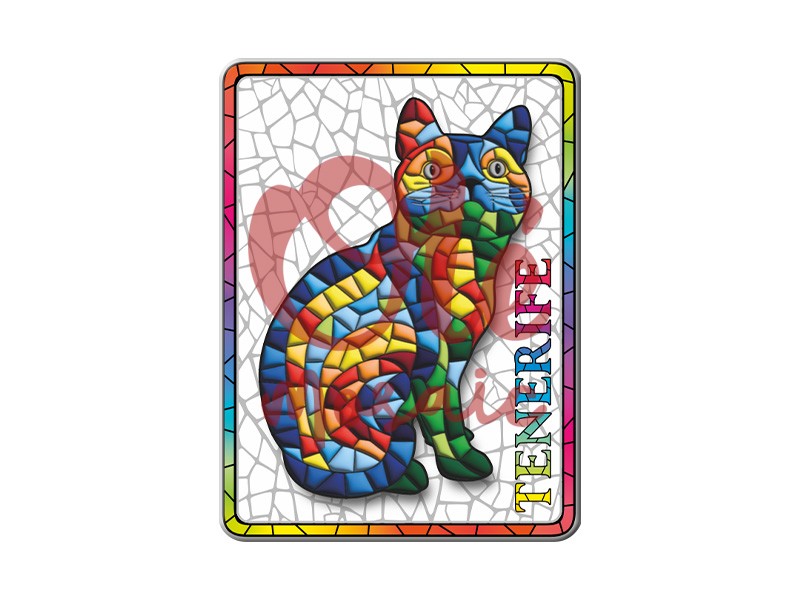 Imán metálico de 8 cm con el simpático diseño de un gato típico de Tenerife. Este imán presenta una composición colorida en tonos vibrantes, inspirada en el arte del mosaico, que destaca por su alegre paleta visual con rojos, amarillos, azules y verdes. Decorado con un fondo blanco que imita la textura de la cerámica tradicional, el imán incluye la inscripción «TENERIFE», convirtiéndolo en un recuerdo perfecto de la isla.
