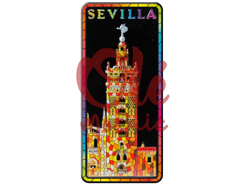 Este imán metálico de 11 cm representa la emblemática Giralda de Sevilla, un auténtico símbolo de la rica herencia cultural andaluza. Con un acabado distintivo en estilo mosaico, este souvenir destaca los majestuosos detalles arquitectónicos del famoso campanario, que se alza orgulloso sobre la ciudad. La variedad de colores vibrantes empleados en su diseño da vida a la torre, mientras que su superficie negra resalta los tonos cálidos de la estructura, creando un contraste visual verdaderamente atractivo. En la parte superior, la palabra «SEVILLA» está elegantemente impresa, convirtiendo este imán no solo en un recuerdo físico, sino en un pedazo de la historia y la cultura sevillana que puedes llevar contigo.