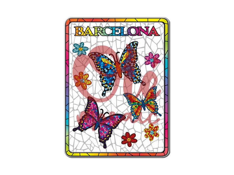Imán de metal con diseño de mariposas inspirado en el vibrante espíritu de Barcelona. Este atractivo imán de 8 cm presenta mariposas decoradas con colores vivos y un acabado plateado, sobre un fondo de mosaico con flores que evoca la riqueza cultural de la ciudad. Ideal para añadir un toque artístico y colorido a cualquier superficie, es un recuerdo perfecto de uno de los destinos más emblemáticos de España.