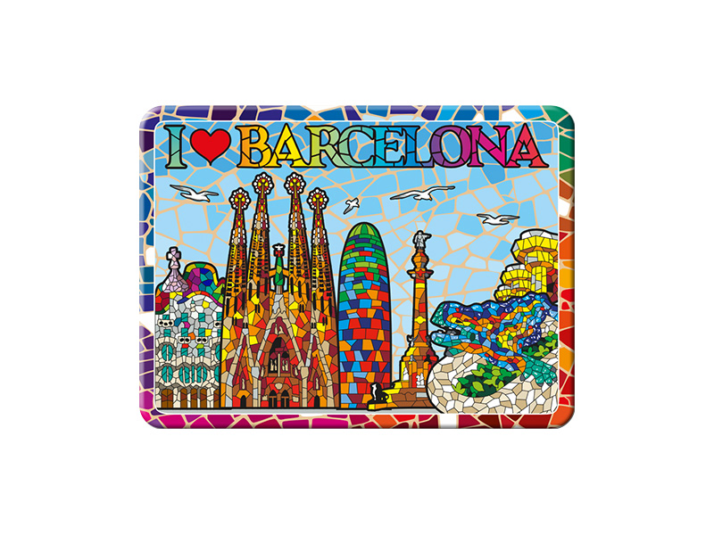 Imán metálico con una vibrante panorámica de Barcelona, de 8 cm. Este atractivo imán presenta un diseño colorido en estilo mosaico, destacando monumentos emblemáticos como la Sagrada Familia y el Parque Güell, todo bajo un cielo azul radiante. Con el texto «I ♥ Barcelona» en letras llamativas, es una representación perfecta del espíritu creativo de la ciudad. Ideal como recuerdo o regalo que evoca la esencia de esta icónica metrópoli española.