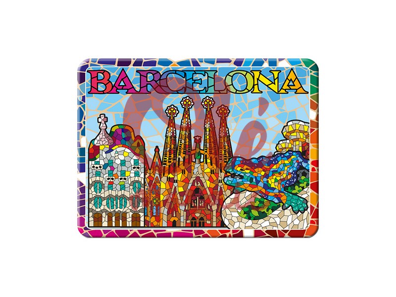 Imán metálico con una colorida panorámica de Barcelona, de 8 cm. Este atractivo imán presenta una vibrante representación de la Sagrada Familia y el famoso mosaico del Parque Güell, destacando el estilo arquitectónico de Antoni Gaudí. Los detalles cerámicos y el uso de tonos vivos, combinados con la palabra «Barcelona» en letras llamativas, hacen de este producto un recuerdo ideal que captura la esencia de la ciudad.