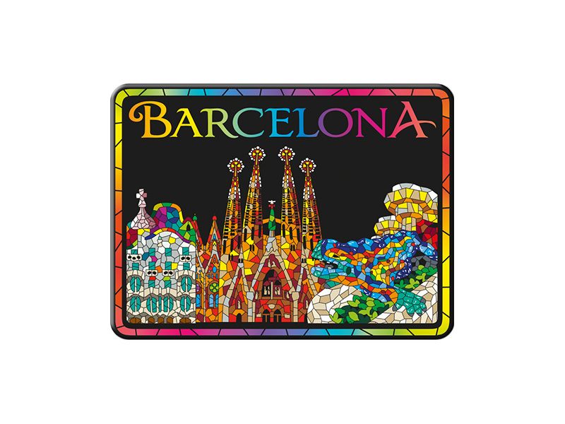 Imán de metal con una panorámica de Barcelona que destaca la emblemática Sagrada Familia y el célebre Dragón del Parque Güell. Este atractivo imán de 8 cm presenta un diseño vibrante, realzado por una técnica de mosaico que captura la esencia visual de estos iconos arquitectónicos. La Sagrada Familia se alza majestuosamente, con sus altas torres y sus intrincados detalles en colores cálidos que reflejan el genio de Antoni Gaudí, mientras que el Dragón del Parque Güell, con sus colores azules y verdes, añade un toque lúdico y distintivo al diseño.