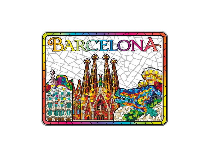 Imán metálico con una vibrante panorámica de Barcelona, presentado en un diseño de 8 cm que destaca elementos emblemáticos como la Sagrada Familia y el famoso dragón del Park Güell. Este atractivo imán, adornado con un colorido mosaico de azules, amarillos y rojos, encapsula la esencia artística de la ciudad. La palabra «Barcelona» está elegantemente impresa en un estilo llamativo, lo que convierte a este imán en un recuerdo ideal para los amantes de la ciudad.
