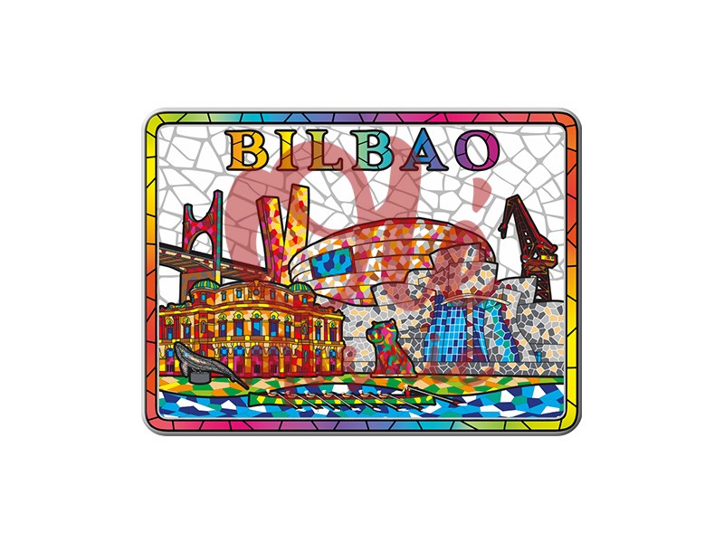 Este imán metálico presenta una vibrante panorámica de Bilbao, capturando la esencia de esta emblemática ciudad del País Vasco en un atractivo formato rectangular de 8 cm. Su diseño colorido, que destaca por un mosaico repleto de formas y matices, ilustra el famoso Museo Guggenheim y el icónico puente de Euskalduna, símbolos arquitectónicos que definen la modernidad y el dinamismo de Bilbao. Las letras grandes y claramente visibles que forman el nombre «BILBAO» añaden un toque distintivo, transformando este imán en un auténtico souvenir que evoca la memoria de una visita inolvidable.
