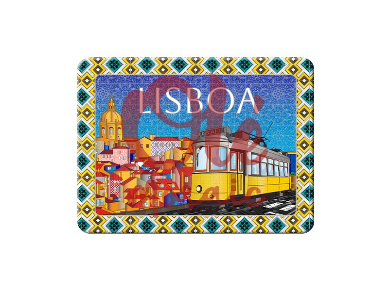 Imán metálico con una colorida panorámica de Lisboa, de 8 cm. Este atractivo imán presenta una vibrante ilustración del emblemático tranvía amarillo recorriendo las pintorescas calles de la ciudad, junto a casas de tonos cálidos que representan la arquitectura típica lisboeta. Decorado con un borde de mosaicos azules y amarillos, incluye el texto «LISBOA» en letras blancas, capturando la esencia cultural de esta hermosa ciudad europea.