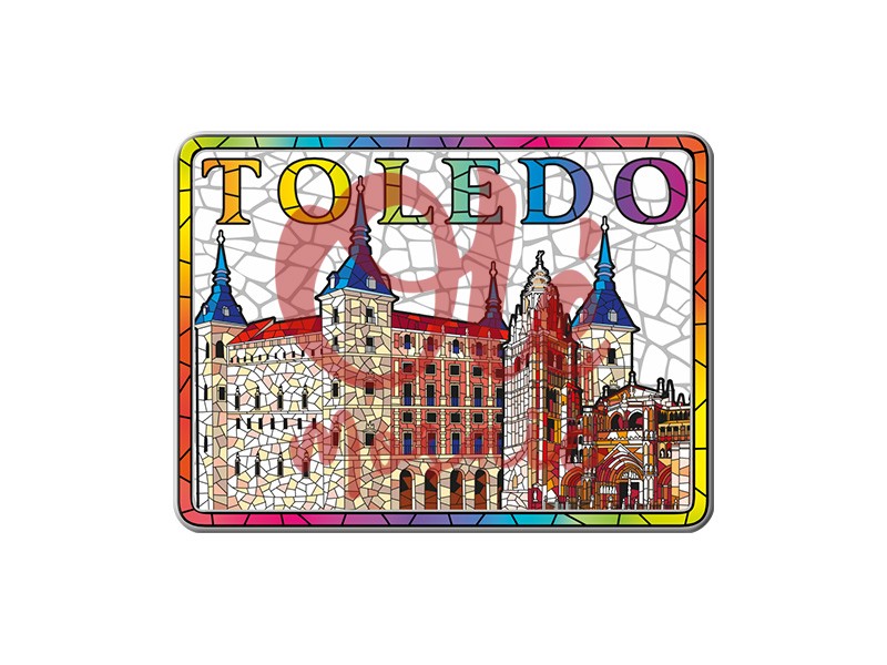 Este imán metálico, con una colorida panorámica de Toledo, es la representación perfecta de la majestuosidad de esta ciudad histórica. Con un tamaño de 8 cm, este atractivo souvenir presenta un diseño inspirado en mosaicos que celebra la rica herencia arquitectónica de Toledo, una de las ciudades más emblemáticas de España. El imán destaca la icónica Catedral, con sus impresionantes torres y detalles góticos, junto al majestuoso Alcázar, un símbolo de la historia militar de la región. La palabra «TOLEDO», impresa en letras vibrantes, se posiciona orgullosamente en la parte superior, mientras que un borde multicolor rodea la panorámica, evocando la tradición cultural de la región y añadiendo un toque de modernidad.