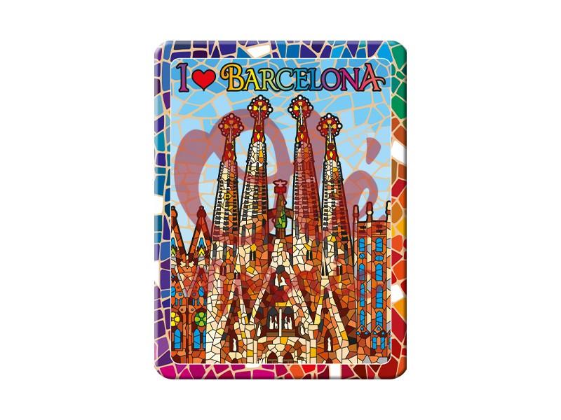 Este imán metálico de 8 cm es una preciosa representación de la icónica Sagrada Familia, uno de los monumentos más emblemáticos de Barcelona. Su vibrante diseño, adornado con un mosaico de colores brillantes, captura la esencia arquitectónica de esta obra maestra de Antoni Gaudí. En la parte superior, la frase «I ♥ Barcelona» destaca en un llamativo tono rojo, añadiendo un toque de calidez y atractivo al diseño. La Sagrada Familia, con sus imponentes torres y magníficos detalles, se alza imponente en el fondo, invitando a los amantes del arte y la arquitectura a sumergirse en su esplendor.