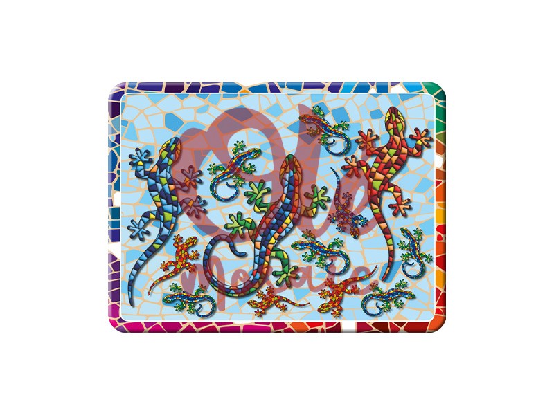 Imán metálico de 8 cm decorado con salamandras coloridas, inspiradas en el icónico estilo del mosaico de Gaudí. Este imán, con un fondo en tonos azules y blancos que evocan el trencadís, muestra varias salamandras en vibrantes colores rojo, verde y azul, destacando por sus minuciosos detalles. Un recuerdo perfecto de la riqueza artística de Barcelona, ideal para embellecer cualquier superficie metálica y llevar un pedazo de arte catalán a casa.