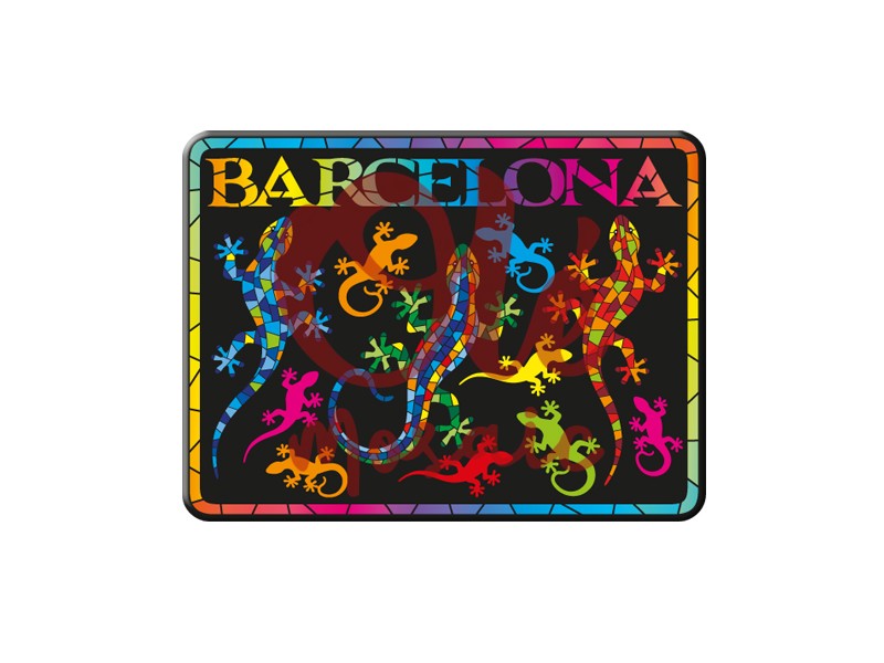 Este imán metálico de 8 cm es una vibrante representación de la creatividad barcelonesa, con una colorida colección de salamandras en diversas posturas. El diseño se inspira en el famoso trencadís, la técnica de mosaico que caracteriza la obra del célebre arquitecto Antoni Gaudí, transformando lo cotidiano en arte. Con un fondo negro que realza los vivos colores de las salamandras, este imán es una pieza llamativa y moderna, ideal para cualquier superficie metálica, como la nevera, un panel magnético o una pizarra.