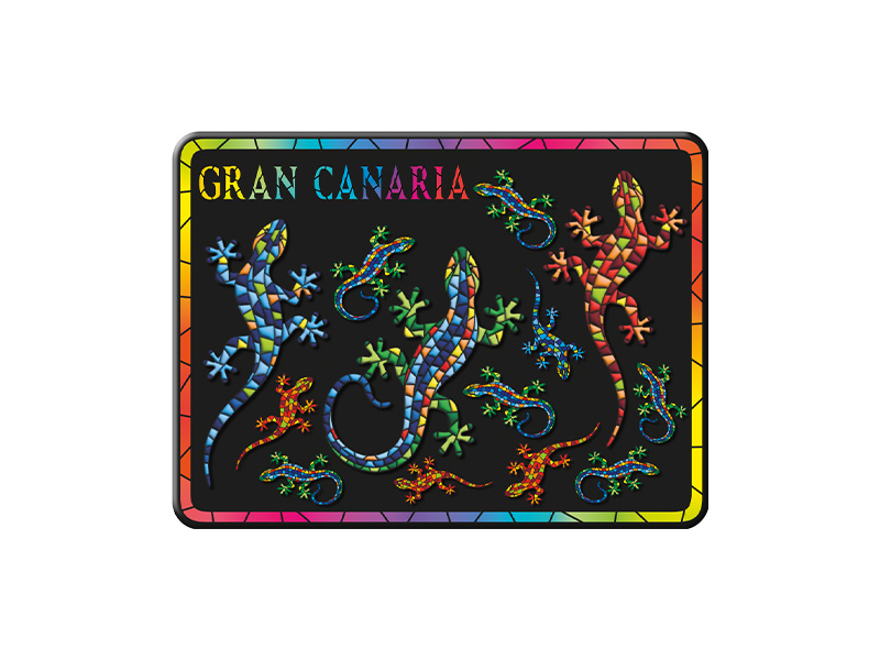 Imán metálico de 8 cm decorado con una vibrante representación de salamandras, inspirado en la fauna de Gran Canaria. El diseño, con técnica de mosaico, presenta una explosión de colores en tonos azules, verdes, amarillos y rojos sobre fondo negro. La palabra «Gran Canaria» aparece en letras coloridas en la parte superior, capturando la esencia de esta preciosa isla canaria. Ideal para recordar tus viajes o como regalo.