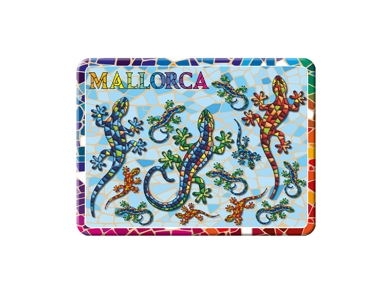 Imán decorativo de metal de 8 cm, inspirado en la fauna de Mallorca, con un diseño que representa salamandras. Este vibrante imán presenta un fondo de mosaico que evoca el arte de la isla, con salamandras en una variedad de colores brillantes, complementadas con detalles de hojas verdes. La palabra «MALLORCA» está impresa en la parte superior, realzando su atractivo como recuerdo típico de la región.