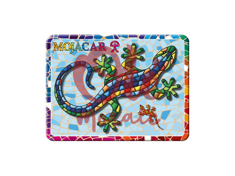 Imán metálico con forma de salamandra, inspirado en la emblemática cultura de Mojácar. Este colorido imán de 8 cm presenta un diseño vibrante en tonos azules, verdes, amarillos y rojos, evocando el famoso mosaico andaluz. La salamandra está adornada con intrincados detalles sobre un fondo texturizado que recuerda las baldosas tradicionales, y el nombre “Mojácar” destaca con letras llamativas en la parte superior, convirtiéndolo en un recuerdo único y atractivo.