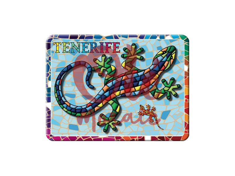 Imán metálico de 8 cm inspirado en la fauna de Tenerife, que representa una colorida salamandra. Este imán, con un diseño vibrante que imita el estilo mosaico, destaca por sus brillantes colores, incluyendo tonos azules, verdes y rojos. El fondo, en azul claro, resalta la figura de la salamandra, mientras que el texto «Tenerife» añade un toque distintivo, capturando la esencia cultural y natural de la isla. Ideal para recordar un viaje a este hermoso destino.