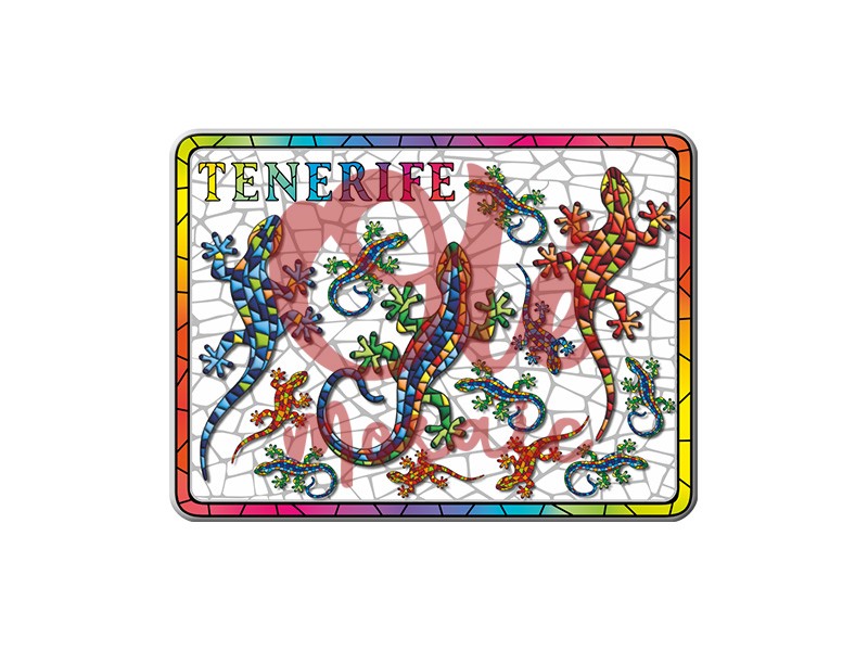 Imán metálico de 8 cm decorado con salamandras de colores, que representan la fauna endémica de Tenerife. Este atractivo imán presenta un diseño vibrante con detalles de mosaico y un fondo de tonos claros que resalta las salamandras en diversos colores, junto con la inscripción “TENERIFE” en letras destacadas. Perfecto para capturar la esencia de la isla canaria y como recuerdo único de su biodiversidad.