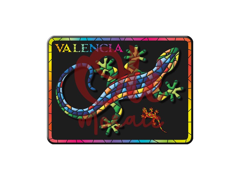 Imán metálico de 8 cm, inspirado en la emblemática salamandra de Valencia. Decorado con un vibrante diseño de mosaico en tonos azules, verdes, naranjas y rojos sobre fondo negro, este imán ofrece una interpretación artística de la salamandra, símbolo de la arquitectura valenciana, con un pequeño detalle de otra especie. Perfecto para recordar la belleza y la cultura de Valencia, este souvenir aúna estética y funcionalidad.