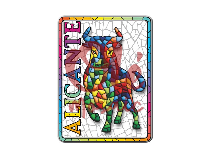 El fondo del imán, con un patrón blanco y sutiles texturas, realza la figura del toro, representado con un estilo moderno, atractivo y lleno de carácter. La palabra «ALICANTE», impresa con un estilo arcoíris, aporta un toque contemporáneo y festivo que complementa la obra, haciendo de este imán una pieza coleccionable que resuena tanto entre los residentes como entre los visitantes.
