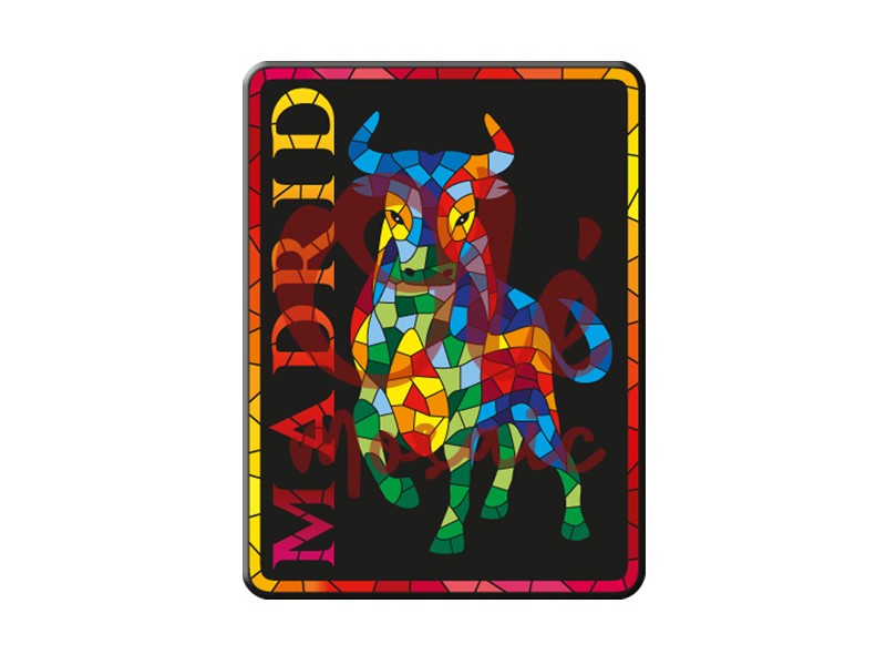 Imán metálico con un diseño vibrante del toro, símbolo icónico de Madrid. Con unas dimensiones de 8 cm, este imán presenta un colorido mosaico que destaca en tonos vivos como el azul, amarillo, rojo y verde, sobre un fondo negro, creando un contraste llamativo. La palabra «MADRID» se imprime en negrita, complementando la representación artística de este emblemático animal. Ideal para recordar una experiencia única en la capital española.