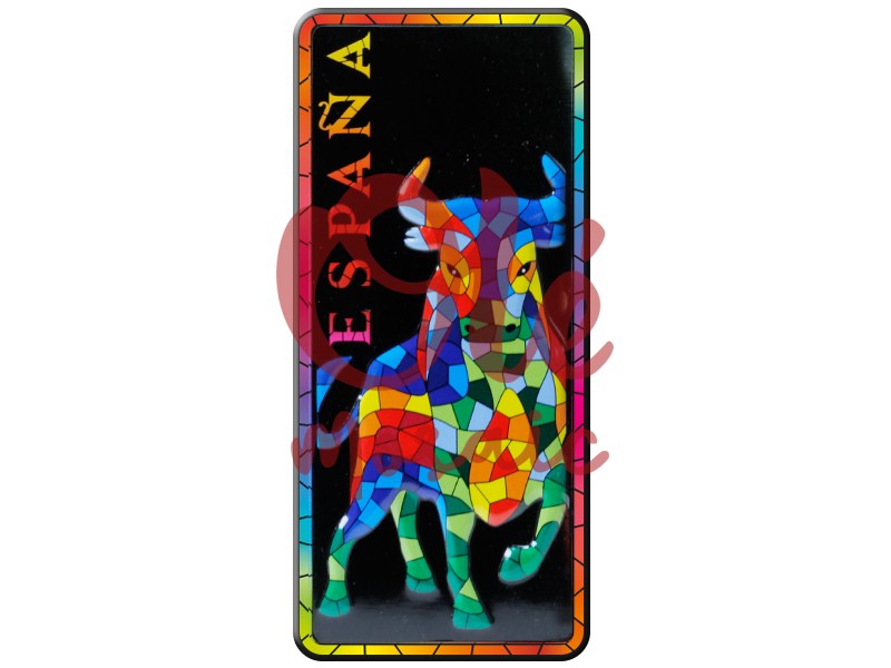 El toro, cuidadosamente diseñado con una variedad de tonos que van desde azules intensos hasta rojos cautivadores y verdes vibrantes, captura la atención y añade un atractivo visual a cualquier frigorífico o espacio donde se exhiba. Sobre esta maravillosa representación, la palabra «ESPAÑA» se imprime con un diseño llamativo, enfatizando el origen del recuerdo y su relevancia como producto representativo de la cultura española.