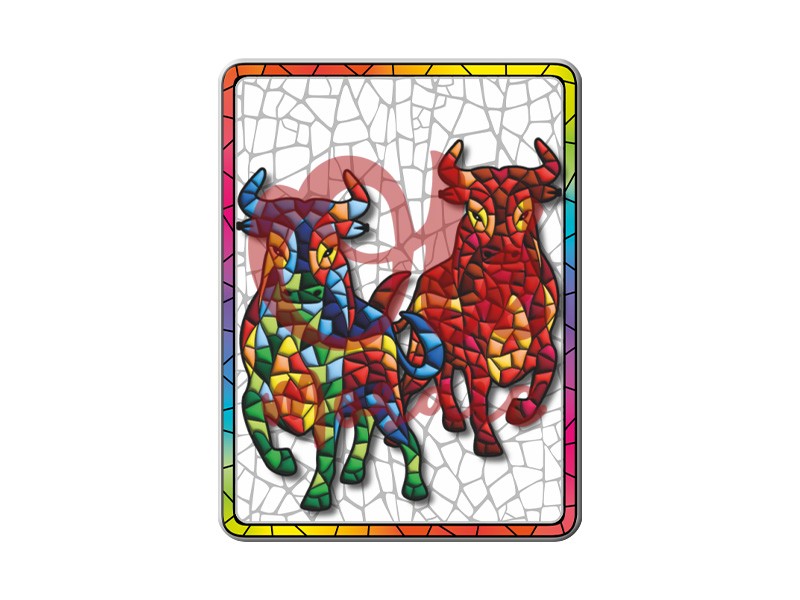 Este imán metálico, con su vibrante diseño de toros en un colorido estilo mosaico, es un auténtico homenaje a la rica tradición taurina española. Con un tamaño de 8 cm, esta pieza representa a dos toros en una danza de vivos colores, destacando en intensos tonos rojos, azules y verdes, que capturan la esencia y la fuerza de estos emblemáticos animales. El fondo, con efecto de cerámica craquelada, evoca el arte clásico español, añadiendo un toque de sofisticación y textura visual que realza el diseño general.