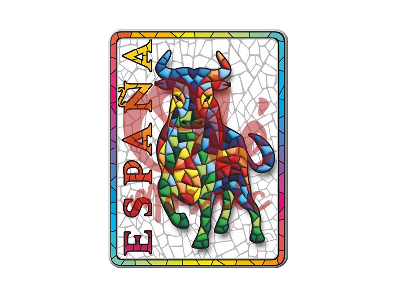 Imán metálico con forma de toro, de vibrantes colores y acabado multicolor, que representa un símbolo emblemático de España. Con 8 cm de tamaño, este imán destaca por su diseño similar a un mosaico, evocando la rica cultura española. Incorpora la palabra «ESPAÑA», añadiendo un toque turístico. Ideal para decorar cualquier superficie metálica, este souvenir combina arte y tradición en una pieza distintiva.