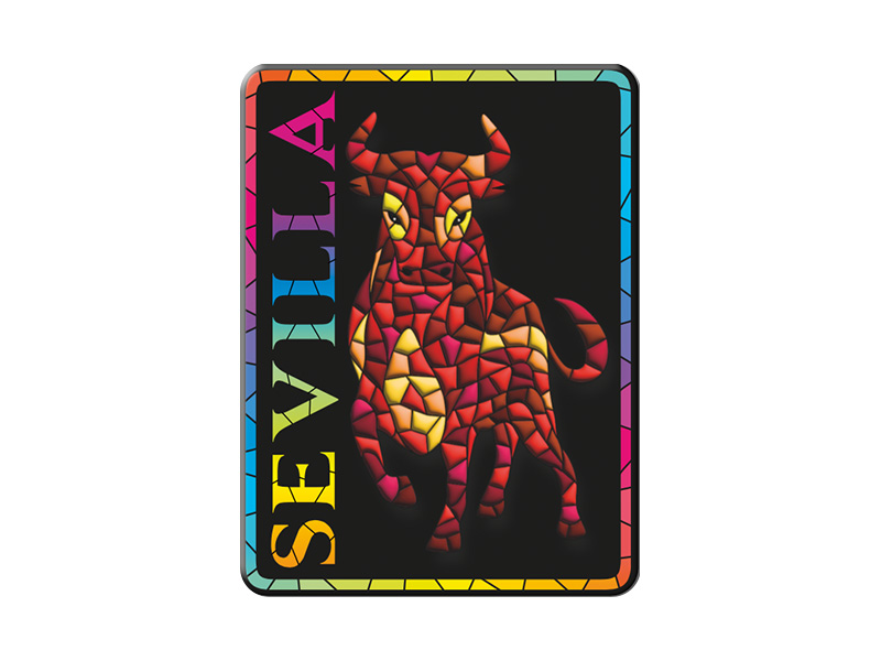 Imán metálico de 8 cm con la representación de un toro, un emblema del folclore español. Su diseño vibrante, en tonos rojos y amarillos sobre fondo negro, destaca por la técnica del mosaico, que le confiere un aspecto artístico y moderno. La palabra «Sevilla» aparece impresa en colores en el lado izquierdo. Un recuerdo perfecto para llevarse un pedazo de la cultura sevillana a casa.