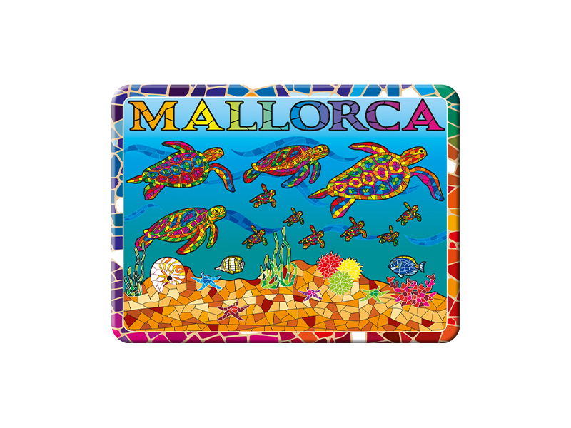 Imán metálico de 8 cm inspirado en las tortugas marinas de Mallorca. Este colorido imán presenta una ilustración vibrante con tortugas nadando sobre un fondo azul, rodeadas de elementos marinos como corales y peces, todo en un estilo mosaico. La palabra «MALLORCA» destaca en la parte superior, complementando este alegre y pintoresco recuerdo que captura la esencia de la vida submarina de la isla. Ideal para llevar un pedacito de Mallorca a casa.