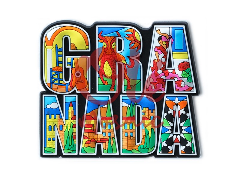 Este imán de PVC presenta una colorida panorámica de Granada, capturando la esencia vibrante de esta fascinante ciudad andaluza. Su atractivo diseño incluye elementos icónicos que representan la riqueza cultural de la región, como una guitarra, un dragón emblemático, una bailaora de flamenco en movimiento y la majestuosa Alhambra como telón de fondo. Cada letra de «GRANADA» está meticulosamente decorada, combinando motivos que evocan el folclore local, ofreciendo un toque de alegría y esplendor. La vibrante paleta de colores utilizada en la ilustración no solo resalta la belleza de la ciudad, sino que también refleja la calidez y hospitalidad de sus gentes.