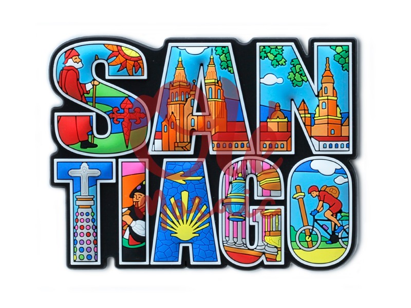 Imán de PVC con una colorida panorámica de Santiago, que captura la esencia cultural de la ciudad. Este imán presenta la palabra «Santiago» en letras grandes y vibrantes, acompañada de iconos emblemáticos como la Catedral y el famoso peregrino. Los detalles incluyen elementos arquitectónicos y símbolos, pintados en tonos brillantes de azul, rojo y verde, que evocan la historia y el folclore de esta ciudad gallega. Perfecto para recordar un viaje inolvidable.