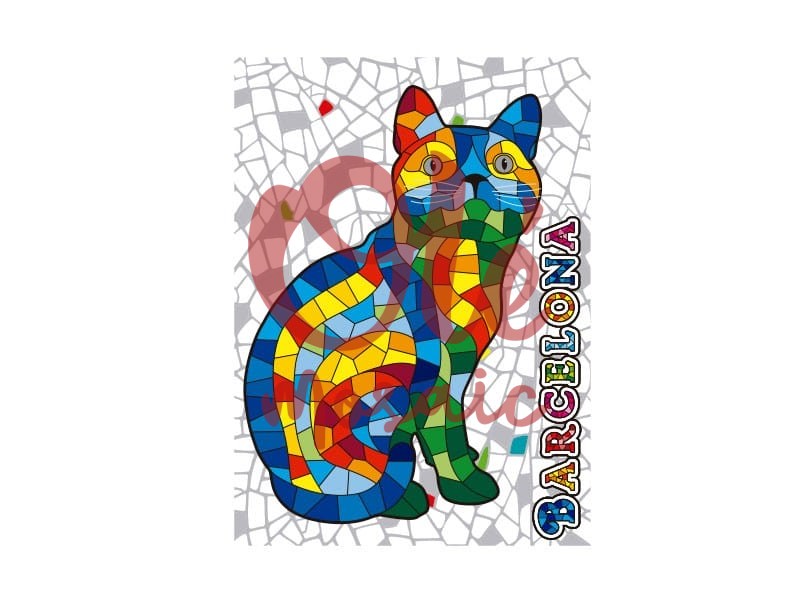 Imán con forma de gato, inspirado en el arte del mosaico de Barcelona, de 7,5 cm. Este atractivo imán presenta una vibrante paleta de colores, con azules, rojos, amarillos y verdes, que capturan la esencia lúdica de la ciudad. La figura del gato, símbolo de la cultura local, está diseñada con un estilo que recuerda a las obras de Gaudí, destacando sobre un fondo de trencadís que complementa la estética colorida. Perfecto para llevar un pedazo de Barcelona a tu hogar.