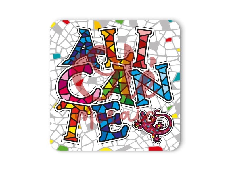 Imán con un letrero colorido que dice «ALICANTE». Este atractivo producto presenta letras con diferentes colores y diseños, evocando el estilo mosaico tan característico. El fondo blanco y gris, con detalles en rojo, azul y amarillo, le da un toque moderno y vibrante. Incluye un simpático dibujo de un lagarto, símbolo distintivo de la región. Ideal para recordar tu visita a Alicante o como un regalo original.