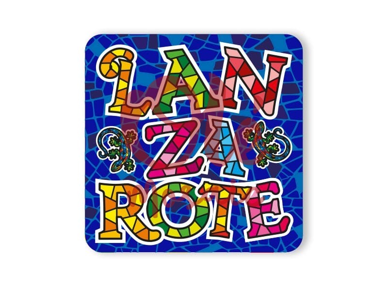 Imán con un letrero colorido que reza «LANZAROTE», inspirado en la vibrante cultura de esta isla canaria. El diseño presenta una base azul decorada con patrones que evocan el famoso arte del mosaico, destacando colores vivos como el rojo, el amarillo y el verde. Elementos distintivos como hojas y motivos orgánicos en los laterales complementan la composición, convirtiendo este imán en un atractivo recuerdo de Lanzarote, ideal para adornar cualquier frigorífico o superficie metálica.