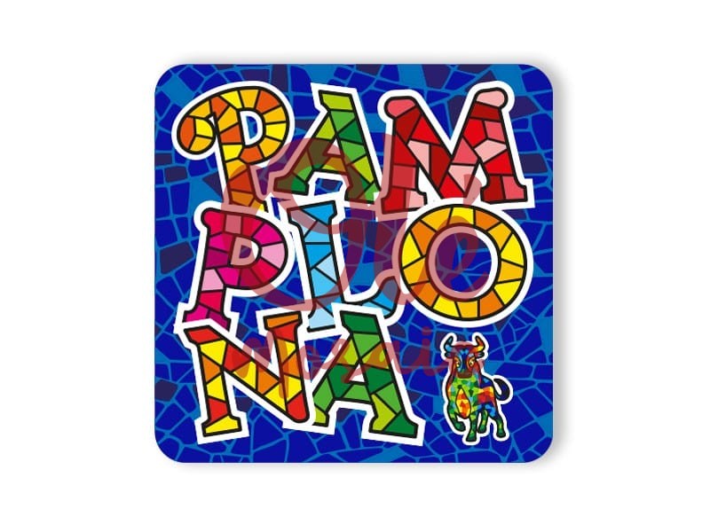 Imán con un letrero colorido que destaca la ciudad de Pamplona. Este atractivo recuerdo presenta la palabra «PAMPLONA» en letras grandes y vibrantes, elaboradas con un diseño de mosaico que resalta los tonos azul, rojo, amarillo y verde. Junto a la tipografía, un encantador dibujo de un toro colorido añade un toque distintivo, representando una parte esencial del folclore navarro. Ideal para recordar momentos en esta emblemática ciudad.