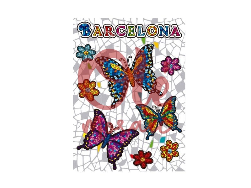 Imán de 7,5 cm con un colorido diseño de mariposas inspirado en el arte del mosaico barcelonés. Esta pieza decorativa incluye varias mariposas en vibrantes tonos azules, morados y naranjas, acompañadas de flores que complementan el diseño. El fondo presenta un patrón de mosaico gris que evoca la arquitectura modernista de la ciudad, lo que convierte a este imán en un recuerdo ideal que captura la esencia artística de Barcelona.