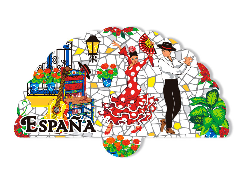 Imán con forma de abanico, que evoca el ambiente festivo de España. Este colorido imán presenta una escena vibrante en un patio andaluz, donde dos bailarines de flamenco, ataviados con trajes tradicionales, bailan con alegría. El fondo está decorado con azulejos al estilo mosaico, flanqueado por macetas con flores y una guitarra, elementos que realzan el encanto cultural del sur de España. Incluye la palabra «España» en letras destacadas, lo que lo convierte en un recuerdo perfecto.