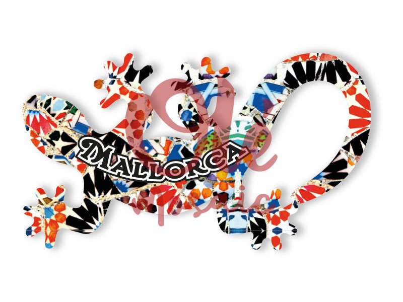 Imán con forma de salamandra, que captura la esencia de Mallorca. Este colorido recuerdo de 10 cm está adornado con un vibrante mosaico de tonos azules, rojos y amarillos, evocando el folclore mediterráneo. La figura incluye un elegante texto «MALLORCA» integrado armoniosamente en el diseño. Perfecto para recordar la calidez de la isla y su rica cultura, ideal para decorar cualquier superficie metálica.