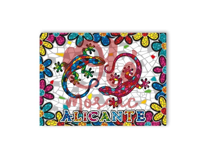 Imán decorado con dos salamandras coloridas y un marco de flores vibrantes, que representan el encanto de Alicante. Con un tamaño de 7,5 cm, este imán presenta un diseño alegre y visualmente atractivo, con detalles en amarillo, rojo, verde y azul que evocan la rica flora local. El fondo de mosaico le da un toque artístico, convirtiéndolo en un souvenir ideal que captura la esencia mediterránea de la región.