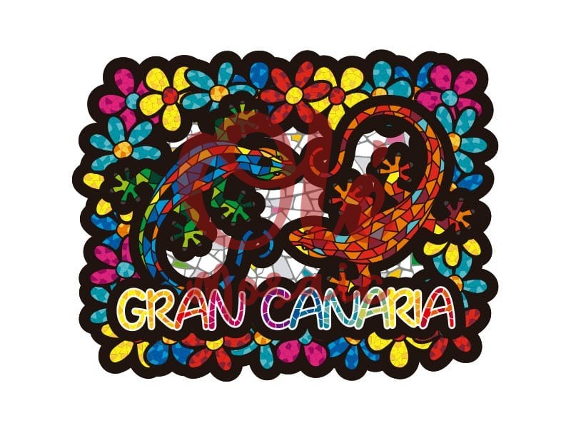Imán con un diseño vibrante que representa una salamandra y flores, inspirado en la biodiversidad de Gran Canaria. Este colorido imán muestra dos salamandras en tonos verdes y rojos, rodeadas de un marco floral que destaca por sus vivos colores y formas. El texto «GRAN CANARIA» se presenta en una tipografía alegre, lo que convierte a este imán en un recuerdo ideal que captura la esencia y el encanto de la isla.