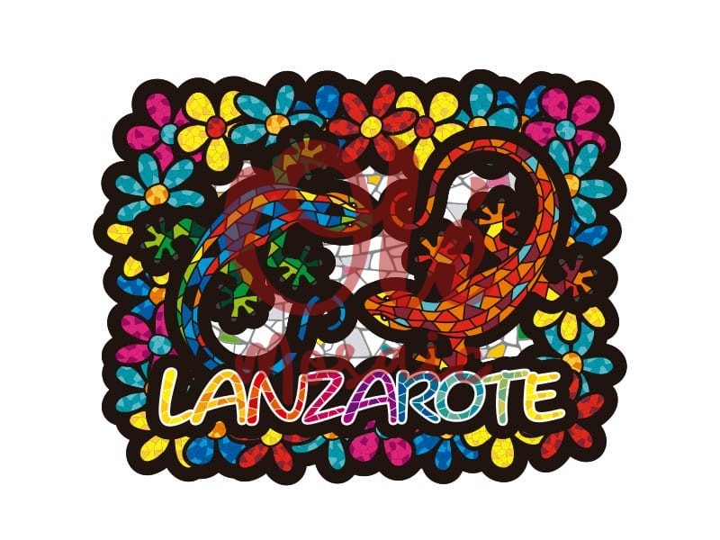 Imán decorado con dos salamandras rodeadas de flores coloridas, inspirado en la belleza natural de Lanzarote. Este atractivo souvenir presenta un diseño vibrante con detalles de mosaico, que resaltan los contornos suaves de las salamandras en tonos verdes y terracota. El fondo floral combina colores como el azul, el rosa y el amarillo, y el nombre «Lanzarote» aparece en un formato llamativo, lo que lo convierte en un recuerdo perfecto de las Islas Canarias.