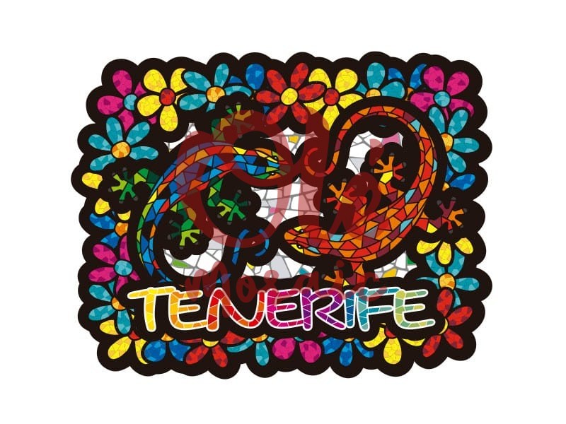 Imán decorado con una vibrante representación de dos salamandras y flores, inspirado en la fauna de Tenerife. Este atractivo imán presenta un diseño colorido que evoca la belleza natural de la isla, con detalles en mosaico que realzan la textura de las salamandras. Las flores de diversos colores enmarcan el motivo, creando una pieza llamativa que destaca la palabra «Tenerife» en colores brillantes, ideal para añadir un toque artístico a cualquier espacio.