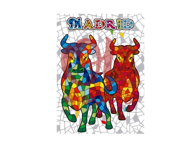 Imán de 7,5 cm que representa dos toros en un diseño colorido y moderno, un símbolo de la esencia cultural madrileña. Los toros, pintados con vibrantes tonos azules, verdes, rojos y amarillos, se alzan sobre un fondo de mosaico que realza su forma característica. El imán incluye la palabra «MADRID» en letras llamativas, lo que lo convierte en un souvenir ideal para evocar la tradición española. Un complemento perfecto para cualquier colección.