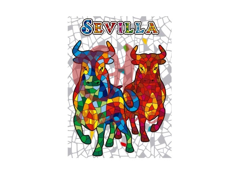Imán de 7,5 cm con una alegre representación de dos toros, símbolo icónico de la cultura española, especialmente de Sevilla. Este imán presenta un diseño vibrante de mosaico con colores que resaltan la fuerza y la belleza de los toros, complementado con la palabra «Sevilla» en letras coloridas. Ideal para añadir un toque festivo a cualquier espacio, este recuerdo es perfecto para conmemorar la tradición taurina y el folclore sevillano.