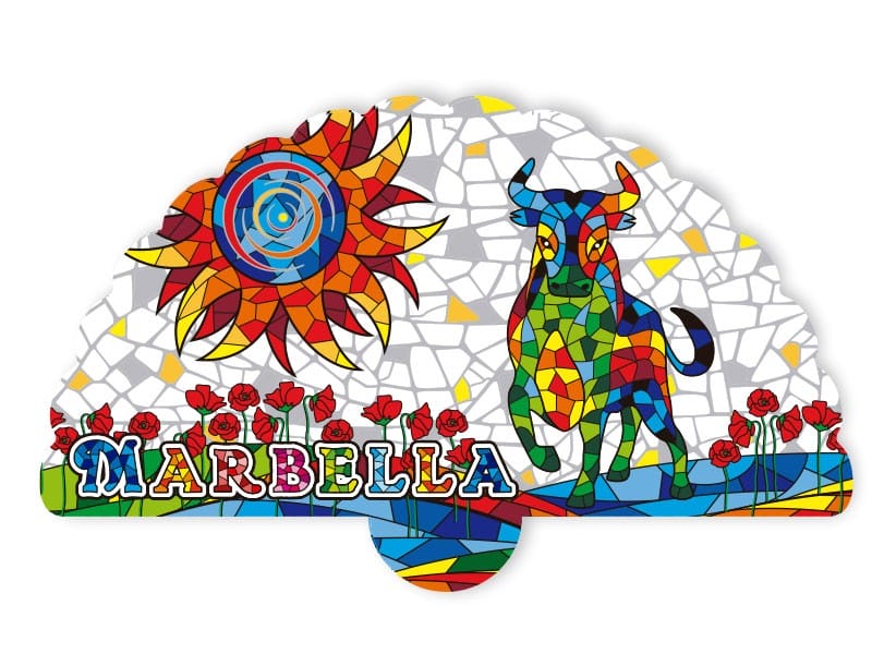 Imán que representa la esencia de Marbella con un vibrante diseño de un toro. Este imán presenta una colorida ilustración inspirada en el arte del mosaico, con un sol radiante y flores rojas en primer plano. Con su forma distintiva y acabado brillante, captura la belleza cultural y el folclore andaluz, convirtiéndose en un recuerdo perfecto de la Costa del Sol. Ideal para coleccionistas o como regalo.