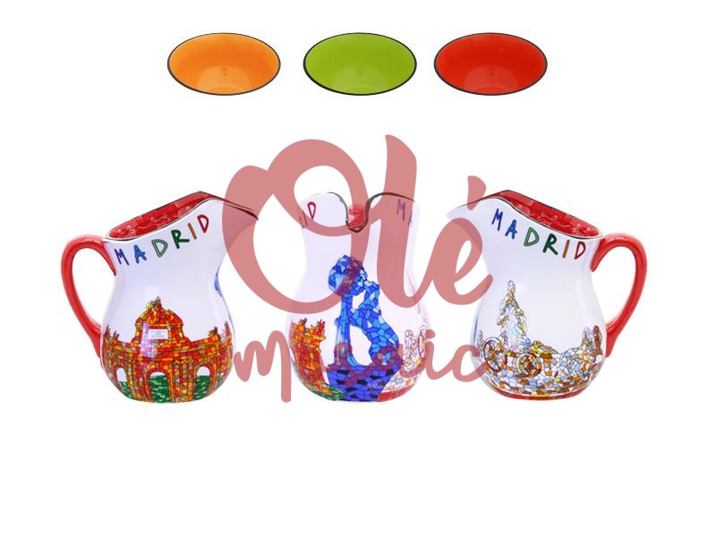 Esta jarra no solo es funcional, sino también decorativa, con un borde rojo que añade un toque de elegancia y sofisticación. Fabricada con técnicas artesanales tradicionales, cada jarra es única, lo que la convierte en un excelente regalo para quienes buscan recuerdos auténticos de su visita a Madrid o para coleccionistas de souvenirs de la ciudad. En Olé Mosaic, nos especializamos en la distribución de souvenirs al por mayor, y esta jarra es una opción perfecta para tiendas de regalos turísticos que deseen ofrecer productos representativos y de calidad. Llévate un trozo de Madrid a casa con esta jarra de cerámica excepcional, un verdadero símbolo de las tradiciones y la herencia cultural de la ciudad.