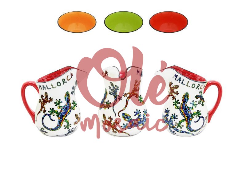 Este encantador producto es una jarra de cerámica decorada con coloridas salamandras, que evoca el estilo tradicional de Mallorca. Con un acabado en tonos beige y vibrantes detalles en rojo, esta jarra destaca por sus elegantes curvas y su diseño artesanal. Cada salamandra y elemento floral está pintado a mano, lo que asegura que cada pieza sea única y posea un sello inconfundible de autenticidad. El nombre «MALLORCA» está delicadamente estampado en la parte superior, añadiendo un toque distintivo que resalta su origen. Esta jarra no solo es perfecta para servir refrescantes bebidas en cualquier ocasión, sino que también aporta un encanto mediterráneo a cualquier mesa gracias a sus vivos colores y su atractivo diseño.