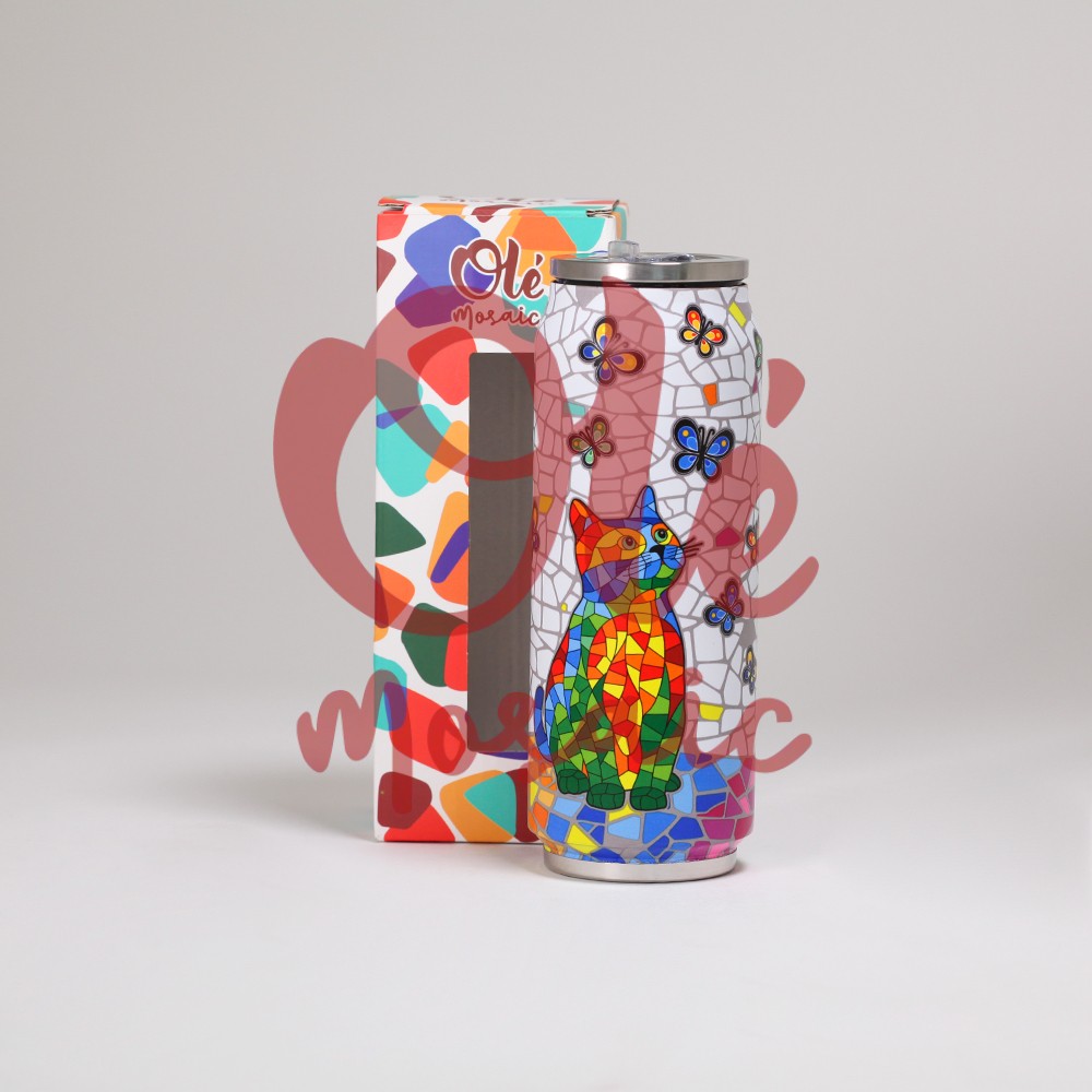 Lata de acero inoxidable de 500 ml decorada con un vibrante diseño de un gato en mosaico, inspirado en la tradición artística española. Este atractivo artículo presenta un fondo blanco que resalta los colores radiantes del gato, complementado con mariposas en tonos azul y verde. Perfecta para mantener frías tus bebidas, su elegante acabado y técnica de estampado garantizan durabilidad y estilo, convirtiéndola en un souvenir ideal para los amantes del arte y la naturaleza.